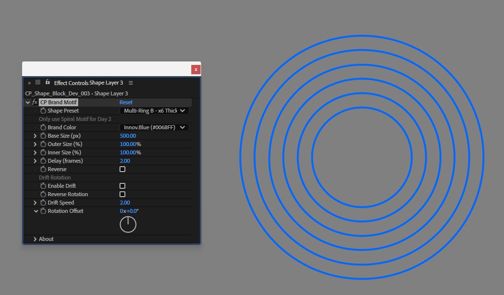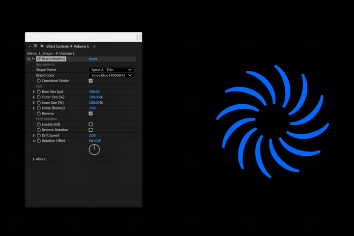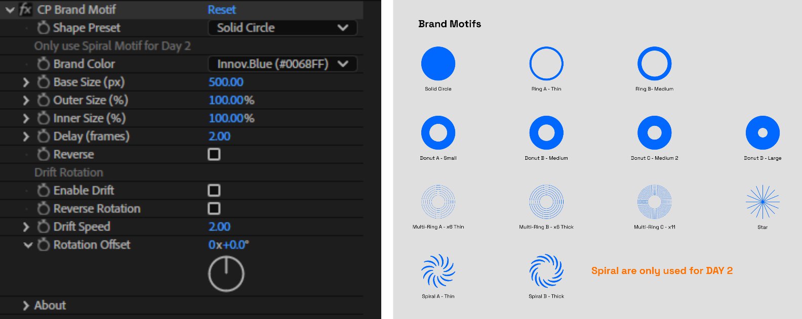 When the client handed us 36 static motif files (12 shapes in 3 different brand colors and sizes!) it quickly became clear that expecting artists to swap these manually would slow down production and invite inconsistency. I saw an opportunity to simplify the process: instead of handing artists a folder of files, I built a custom .ffx preset that recreated the entire system. With just a few dropdowns and sliders, anyone on the team could select a shape, pick a brand color, adjust the size, and add built-in motion like drift and delay. What was once a tedious manual task became a fast, repeatable, and on-brand experience;freeing up artists to focus on animation, not asset management.