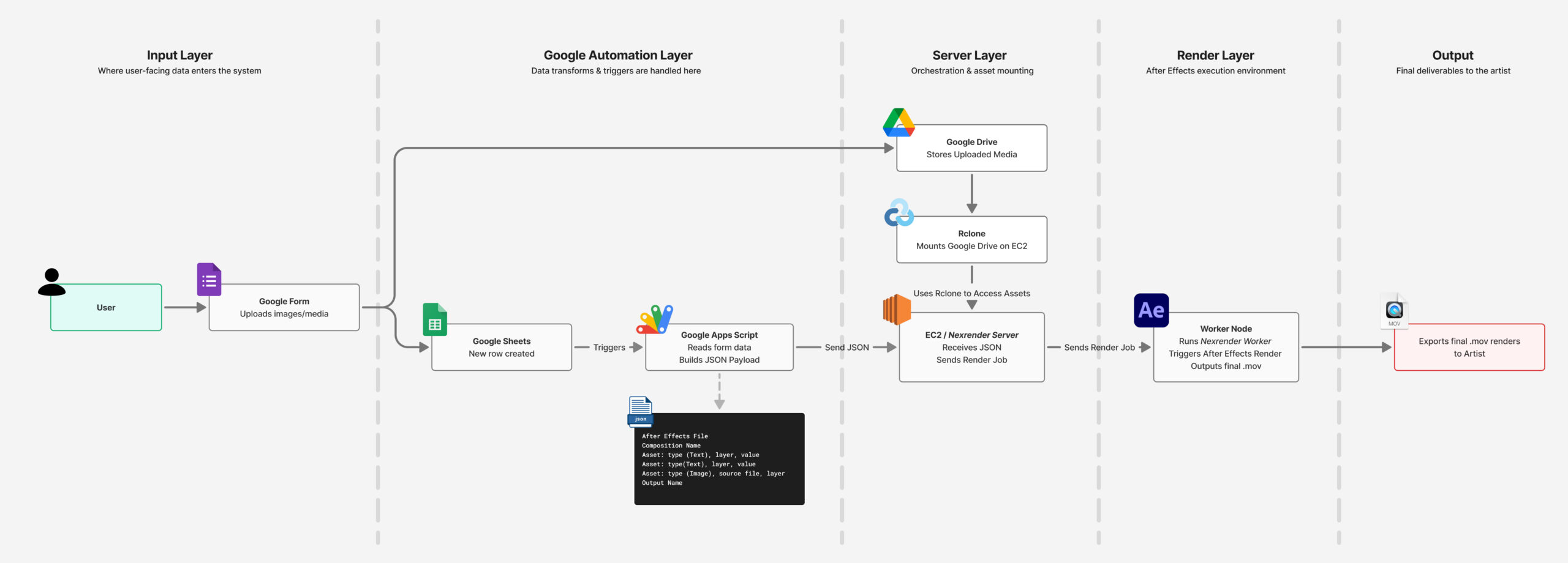 In the diagram below, I mapped and built an end-to-end pipeline that turned a simple online form into a fully rendered video. The experience begins with a Google Form, where users contribute their stories without ever touching creative tools. Their inputs flow into Google Sheets and are transformed by Apps Script into a structured JSON file. From there, an EC2 server orchestrates Nexrender jobs, and a dedicated worker node runs After Effects and the respective project files and compositions headlessly to produce the final .mov files.